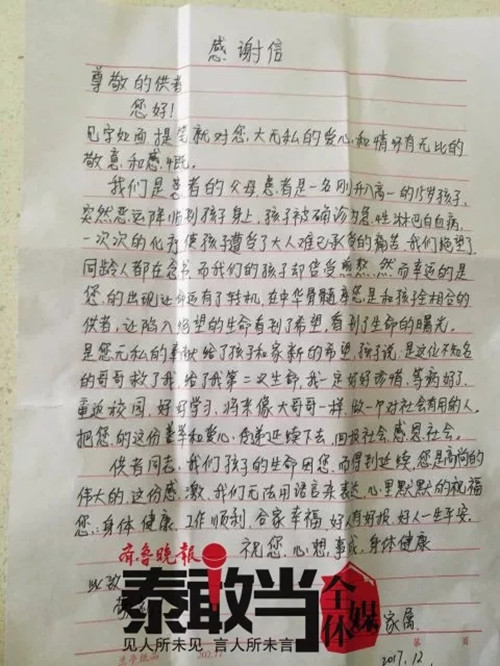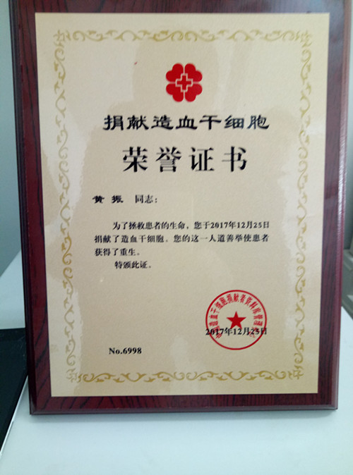2017年12月25日,山东大学齐鲁医院造血干细胞采集中心,山东省第595例,泰安市第15例造血干细胞捐献者来自山东康平纳集团员工黄振接受捐献的是一名刚刚15岁正在上高一的女孩