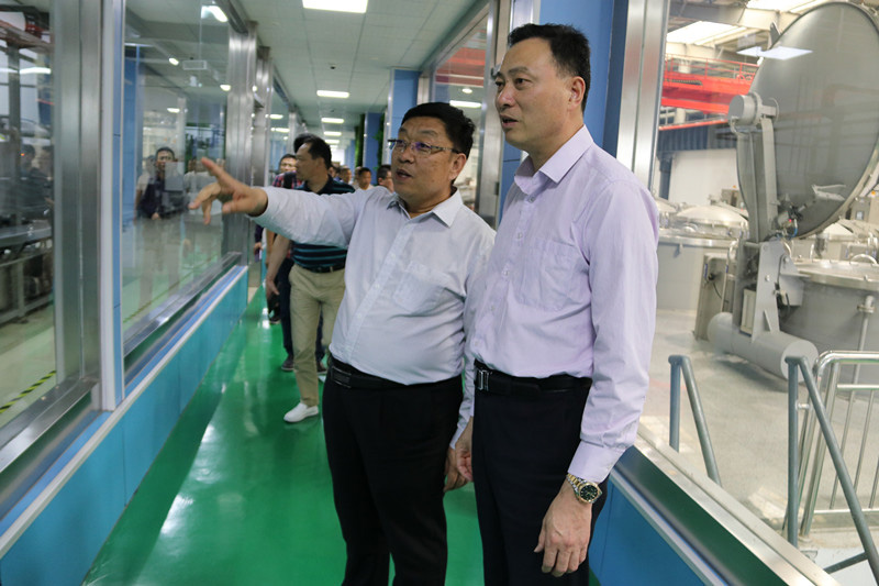 2、集团董事长陈队范向海宁市袜子行业协会会长庄殳松(右一)介绍智能工厂运行情况