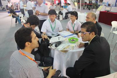 工作人员为国外客户介绍公司产品