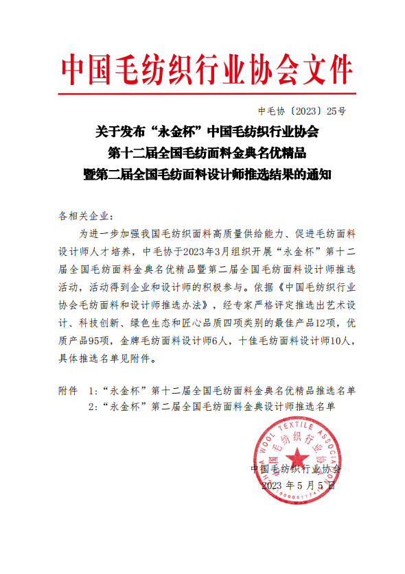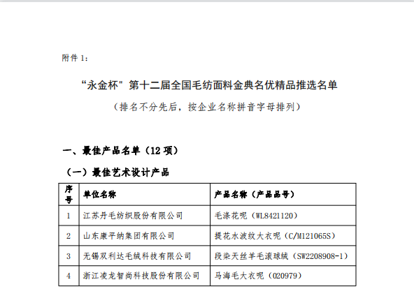 近日,在中国毛纺织行业协会组织开展的“永金杯”第十二届全国毛纺面料金典名优精品暨第二届全国毛纺面料设计师推选活动中,山东康平纳集团有限公司推选的毛纺面料-荣获“永金杯”--最佳艺术设计产品奖及匠心品质产品奖”。